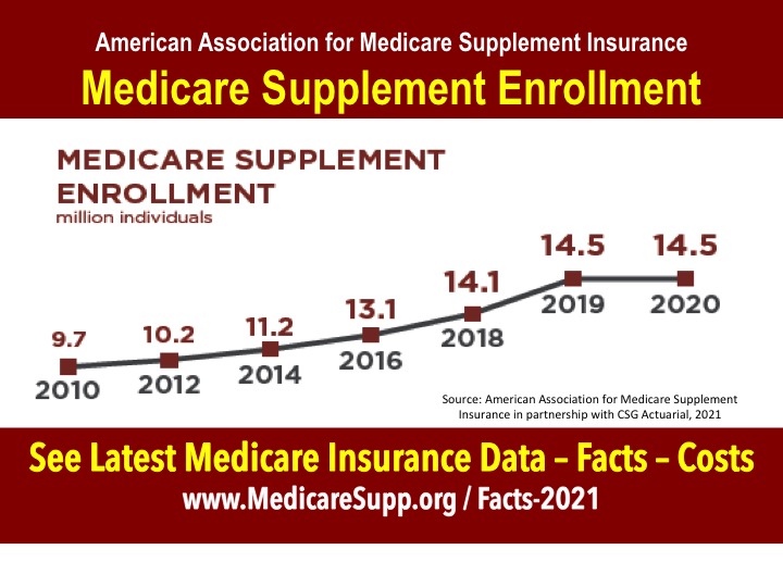 The Association posts Medicare insurance statistics and data on the organization’s website. According to the data, some 9.7 million individuals had Medicare Supplement insurance coverage in 2010. The number grew steadily to 14.1 million in 2018 reaching 2019 in 2019.